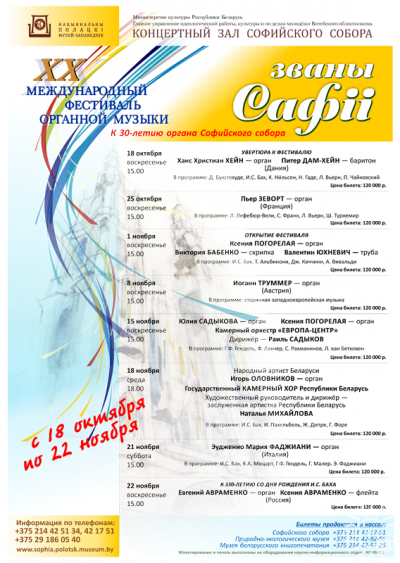 С 18 октября по 22 ноября в концертном зале Софийского собора пройдёт юбилейный XX Международный фестиваль органной музыки "ЗВАНЫ САФІІ"