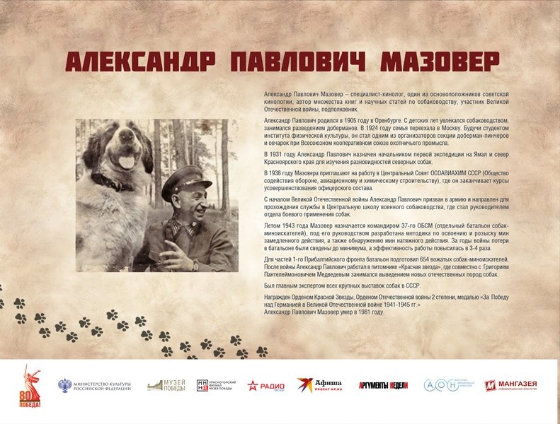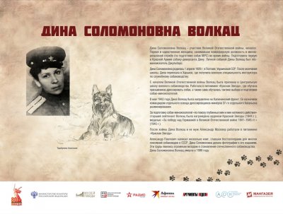 Выставка рассказывает братьях наших меньших – собаках, которые внесли большой вклад в общенародное дело Победы над нацистской Германией. Более 60 000 мохнатых героев прошли боевой путь от Москвы до Берлина. Во время войны части и подразделения Красной Армии впервые в военной истории массово, разнообразно и эффективно применяли служебных собак. В центральной школе военного собаководства животных готовили по 11 видам служб – связи, розыскной, караульной, сторожевой, противотанковой, санитарной, диверсионной, для химической разведки, авиасигнальной, ездовой и минно-розыскной.